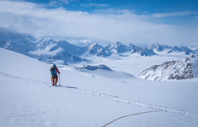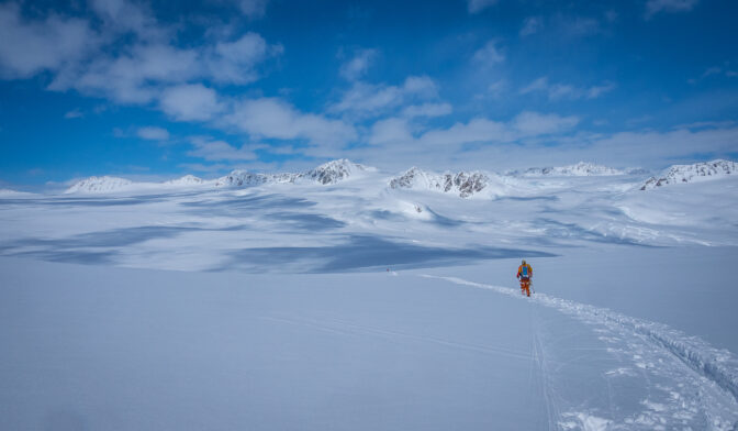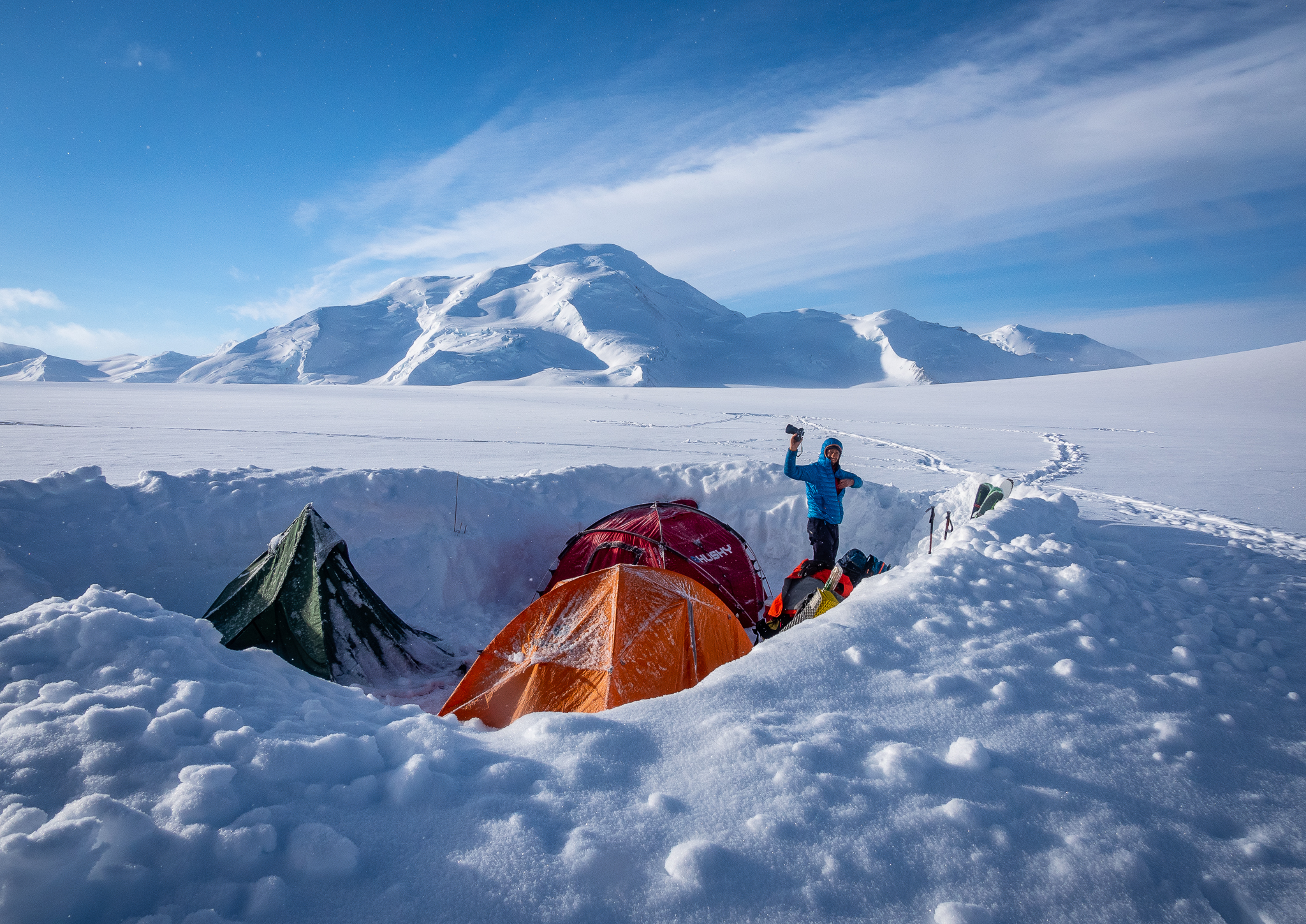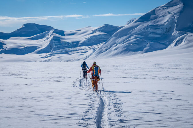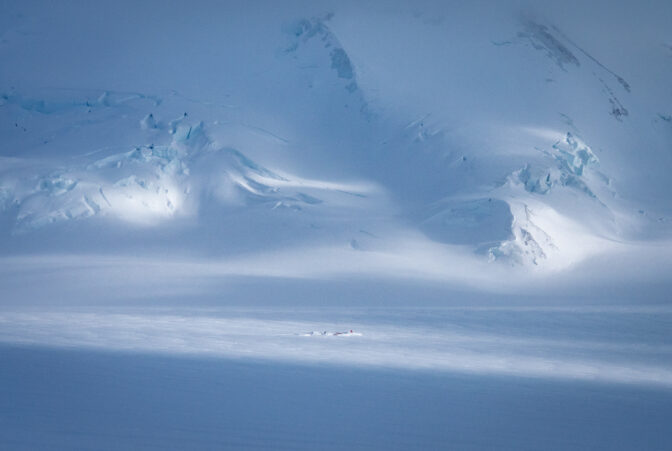 Samo nekoliko tjedana prije ekspedicije, uredno sam odrađivao turno skijaške dane od 1700 metara uspona i 30+ km. Pošto znam da su Tsvetan i Marin u još boljoj fizičkoj kondiciji, iz udobnosti svog kauča, zaključio sam da se uspon na Queen Mary može ostvariti u jednom dugom danu (16+ sati). No, već prvi dan, naše ideje su se susrele s realnošću. četrdesetak centimetara novog laganog snijega koji je napadao značilo je da će nas probijanje staze poprilično usporiti. Ne samo to, već prvi dan bio je bez daška vjetra što je značilo da smo svi “prokuhali”. I u retrospektivi, visina i manjak aklimatizacije su definitivo jako utjecali na sve. Long story short, isprtili smo 7 km, čini mi se, većinom nizbrdo, odlučili se poraženi okrenuti.