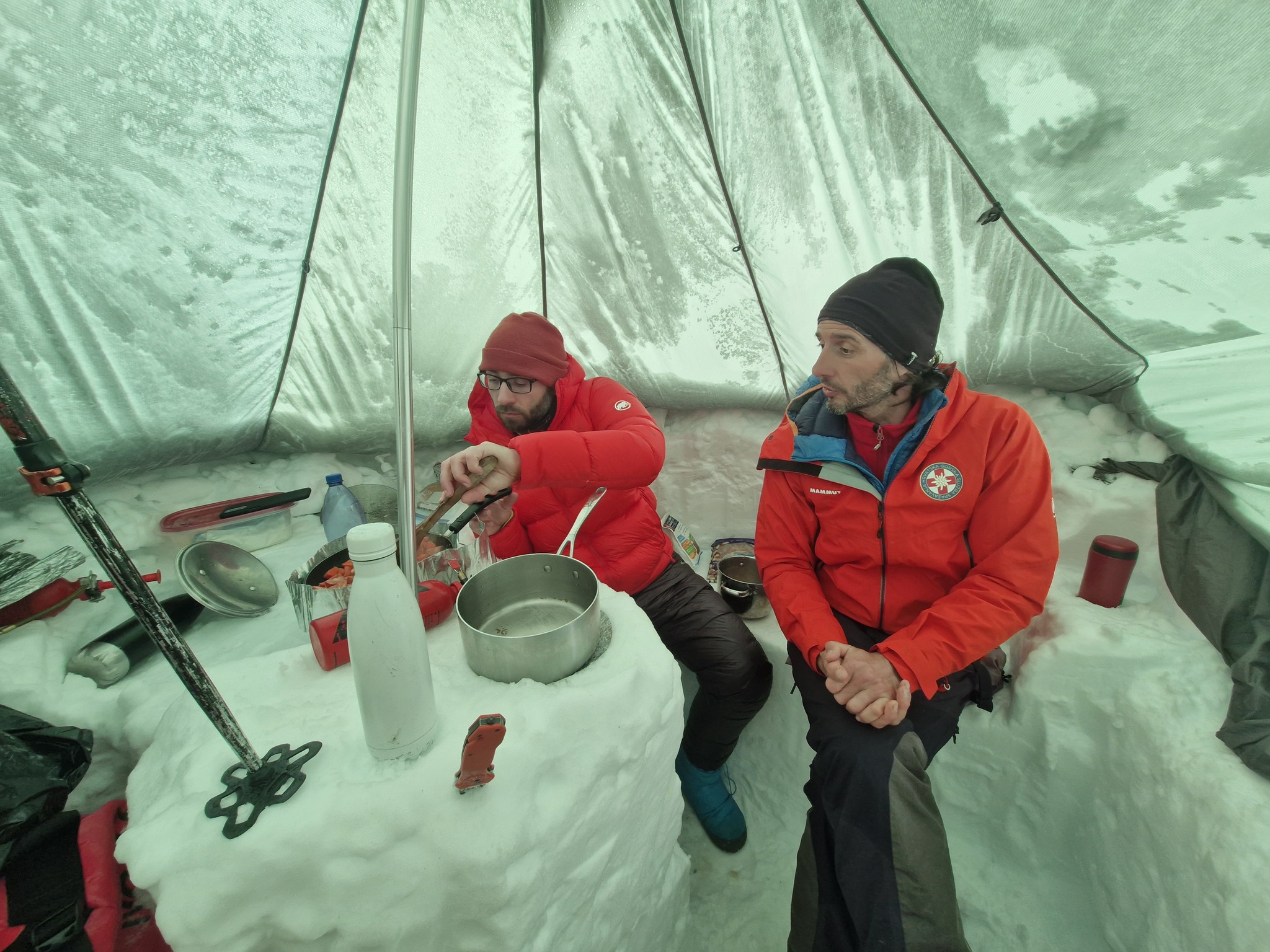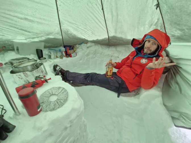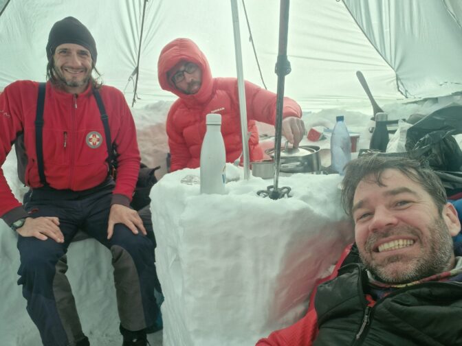 Prva noć nam je bila najhladnija, ako se dobro sjećam, prognoza s InReach satelitskog uređaja je pokazivala -24 C uz olujne vjetrove. Po prognozi, najtoplija noć nam je bila -16 C. No, dobra pernata vreća za spavanje, pernate hlače i pernata jakna i nije toliko loše. Puno veći problem je pogoditi dobru ventilaciju u šatoru, da ima cirkulacije, da izvuče vlagu koju proizvodimo našim disanjem, a da se ne izgubi baš sva toplina. Na ovakvim lokacijama, u našem slučaju, na glečeru na 2700 m visine, kad si u oluji, u oblaku, bilokakvo micanje nema nikakvog smisla. Teško je opisati, ali i 50 metara od baznog logora sve reference nestaju i jedino što možeš razlučiti jest gdje su ti noge. Sve ostalo je zbunjujuće i dezorijentirajuće. Što je gore, a što dolje, koliko se nagnuti za ostati na nogama, sve predstavlja nemogući zadatak. Tako da aktivnosti koje prevladavaju tih dana su ležanje u šatoru, čitanje, svađanje, kuhanje, tračanje. Sreća što Tsvetana i Marina vidim jednom godišnje pa smo imali što tračati i o čemu pričati.