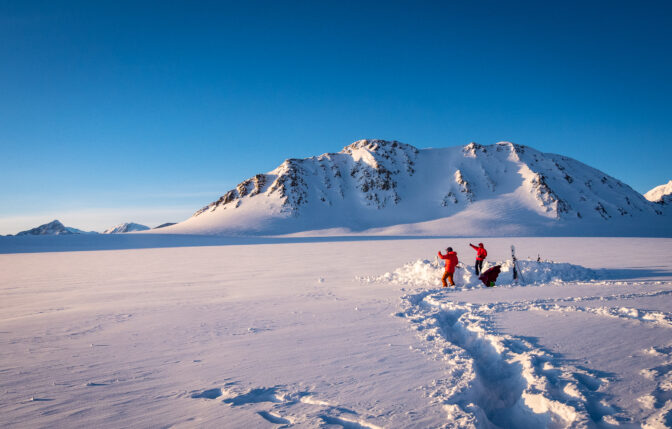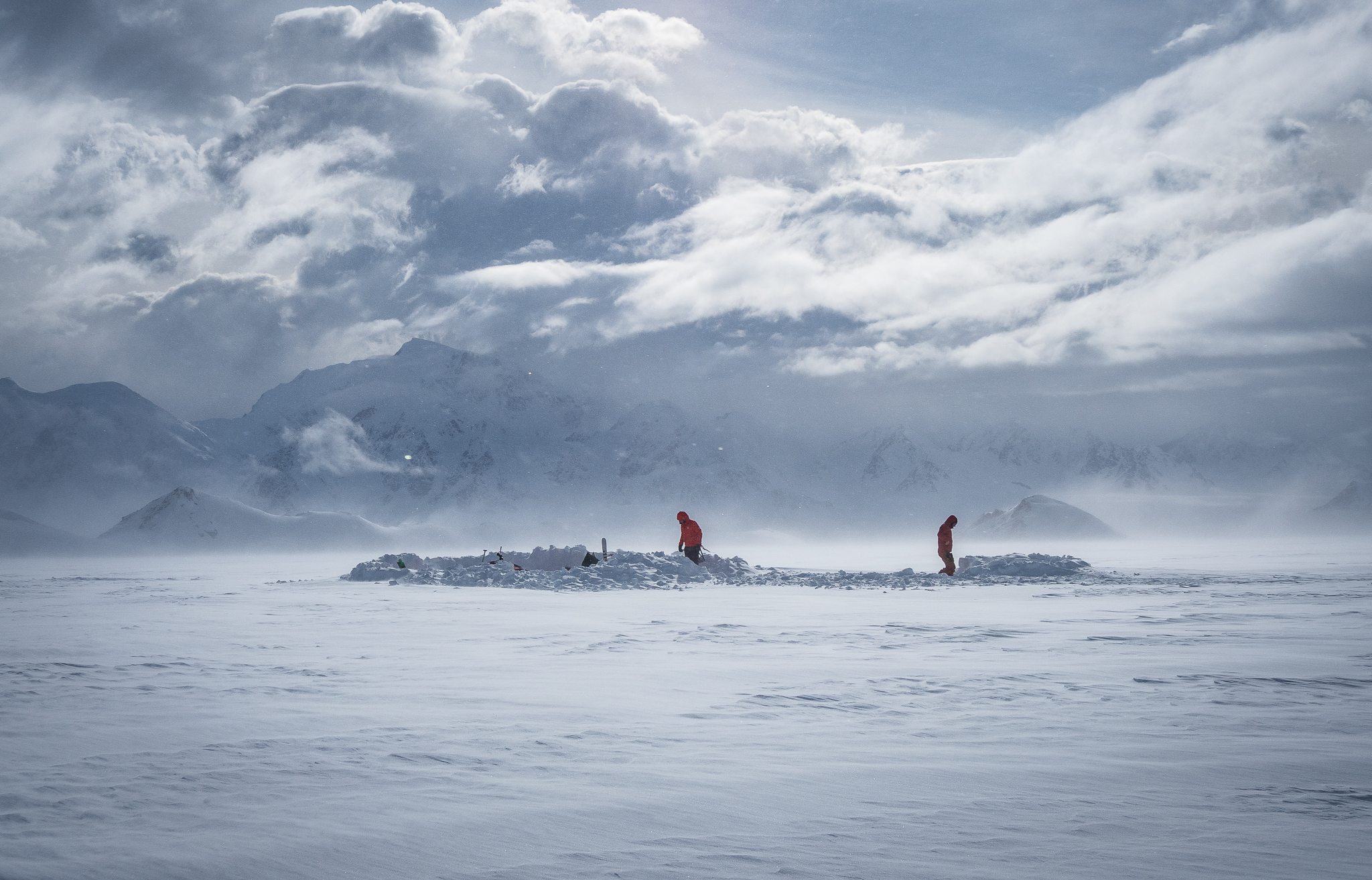 Do kraja predivnog, sunčanog dana smo kopali bazni logor, podizali šatore i zidove te “zvijezdu” ekspedicije, Marinov Deluxe wc! Zalazak sunca je bio predivan, bez puno vjetra i naša prva noć na ledenjaku je bila pred nama. Kod dizanja zidova, koji imaju za cilj sprječavanje vjetra, vodili smo se pilotovim izjavama da većina vjetrova na ovoj lokaciji dolazi s istoka i zapada. Plus, moja opažanja prateći prognoze i boraveći u planinama uz ocean jest da većina oluja dolazi s oceana, u ovom slučaju s juga i jugozapada. Na našu nesreću, prognozirana oluja se obistinila i sve naše ideje oko smjera vjetra su se pokalaze točnima i krivima u isto vrijeme. Puhalo je i nosilo snijeg sa svih strana tako da nakon dva dana odmaranja u šatorima i kopanja snijega, nije nam preostalo ništa drugo nego još podignuti zidove u visinu i zatvoriti sve strane.
